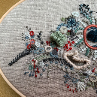 Reinterpretó la pieza ornamental parte de la colección del Victoria & Albert Museum con color y escribió un haikú para acompañar su bordado: